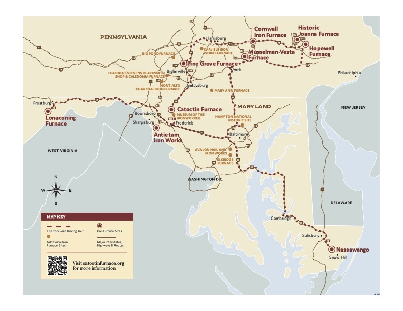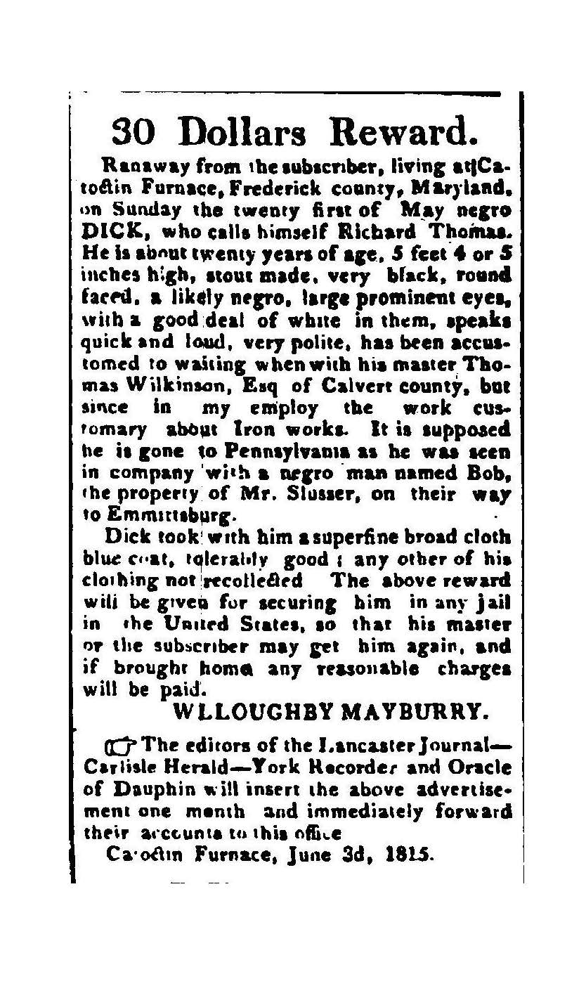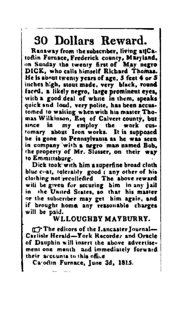 Less than 12.5 miles from the Pennsylvania border, men, women and children enslaved at Catoctin Furnance self-emancipated themselves when they felt the “gitten was good.” The Freedom Seeker Ads printed in area newspapers illustrate their resistance to enslavement.  Yet there is no absolute proof of successful escapes from Catoctin.The Iron Road map below, if overlayed known Underground Railroad routes across the borderland of Maryland and Pennsylvania into Adams and York counties, illustrates how Iron Furnaces frequently shared the same routes to freedom as the Underground Railroad.
